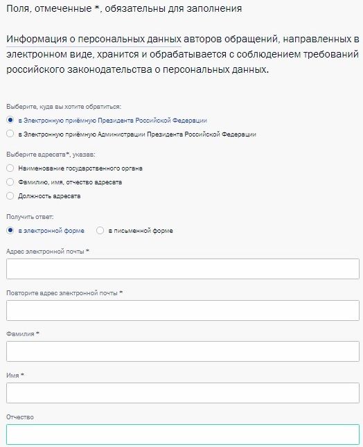 Для удобства пользователей на сайте Администрации Президента представлен функционал, который предназначен для осуществления электронного документооборота http://letters.kremlin.ru/. Но в связи с тем, что в государственных организациях, ведомствах и учреждениях не принимаются анонимные жалобы или заявления граждан, прежде чем приступить к описанию сути вопроса, заявитель должен будет заполнить небольшую регистрационную форму, ответив на такие вопросы: