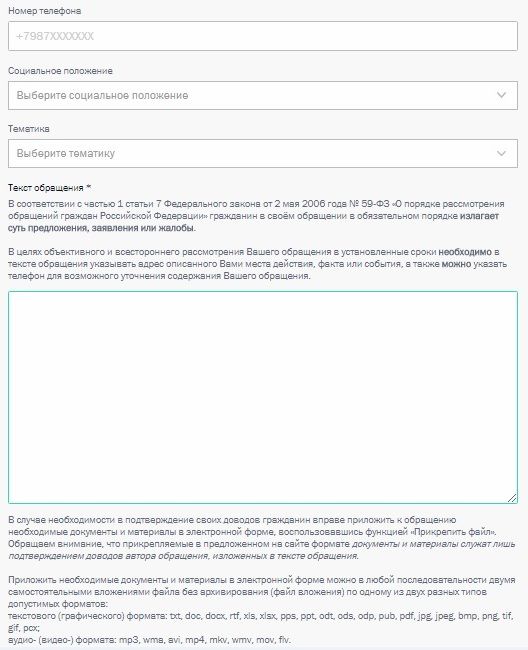 В специально отведенном поле анкеты необходимо написать причину обращения, изложив все обстоятельства и факты. Для объективного и всестороннего рассмотрения рекомендуется указать место действия и персональные данные лиц, которые были участниками инцидента или могут оказать помощь при изучении вопроса. Для уточнения сведений также можно оставить в этом поле контактный номер телефона, что не является обязательным требованием.